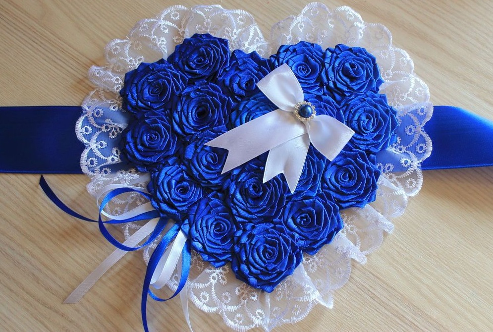Širdelės formos dekoracija, pagaminta iš atlasinių rožių, atrodo neįtikėtinai mielai. Norint sukurti tokį kaspiną mergaitės išrašymo iš ligoninės proga, jums reikės atlasinių juostelių, organzos ir siuvimo reikmenų. Pačius pumpurus lengva surinkti. Rožės gaminamos taip: