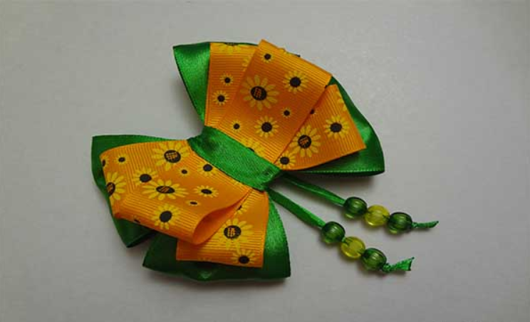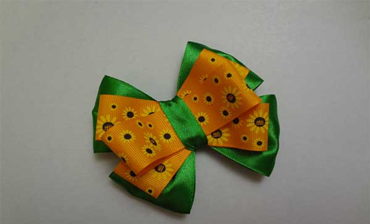 Dviejų spalvų lankeliui pagaminti reikės dviejų skirtingo pločio ir kontrastingų spalvų atlasinių juostelių. Iš didesnės padarykite kilpą ir suklijuokite ją. Siaurąją uždėkite ant plačiosios ir suklijuokite galus. Užriškite mazgą abiejų lankelių sandūroje.