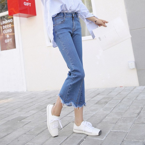 Moteriški džinsai, platėjantys nuo kelių (net jei jie yra trumpinti), vizualiai lieknina siluetą. Tuo tarpu modeliai, kur platėjimas prasideda nuo klubų, priešingai, tinka tik aukštoms merginoms.