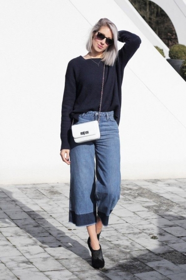 - Akcentavimas – tokie džinsai, derinami su tinkamais aksesuarais ir drabužiais, gali palankiai pabrėžti figūros privalumus. Turite gražias kulkšnis – nereikia jų slėpti. Lengvas papuošalas apyrankės ar klasikinių batelių pavidalu pabrėš eleganciją ir trapumą. Tokia technika vizualiai padaro kojas lieknesnes ir ilgesnes;