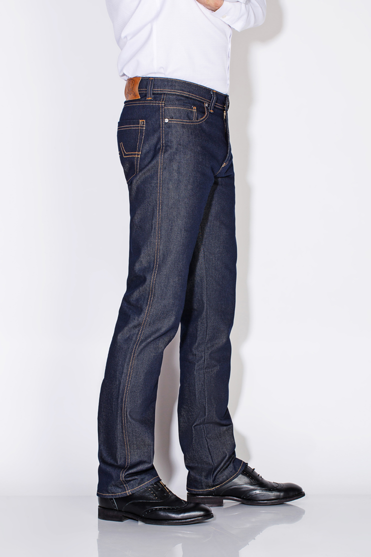 Klasikinės vyriškos džinsinės kelnės – tai gaminys, tvirtai aptemptas aplink juosmenį, siekiantis batų nugarėlės vidurį. Jos pagamintos iš įvairaus tankio džinsinio audinio. Šio modelio priekyje suformuotos mažos akordeono formos klostės, kurios puikiai paslepia kai kuriuos vyriškos figūros trūkumus. Jie idealiai tinka plačių klubų vyrams, stipriosios lyties atstovams, turintiems per didelį kojų kreivumą, nes leidžia be papildomo sudėtingumo ištaisyti vyriškos figūros trūkumus.