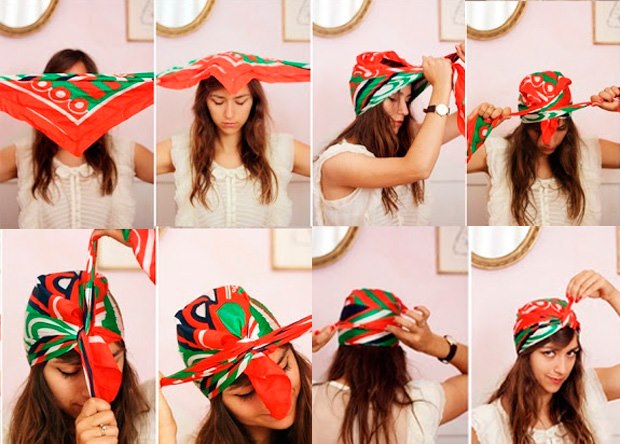 Apie tai, kaip teisingai užsirišti turbaną, galite paskaityti internete. Norėdami tai padaryti, surinkite plaukus į kuodą pakaušyje arba viršugalvyje. Šis galvos apdangalas reiškia kirpčiukų nebuvimą, tačiau kai kurie modeliai įdomiai atrodo ir su palaidais plaukais.