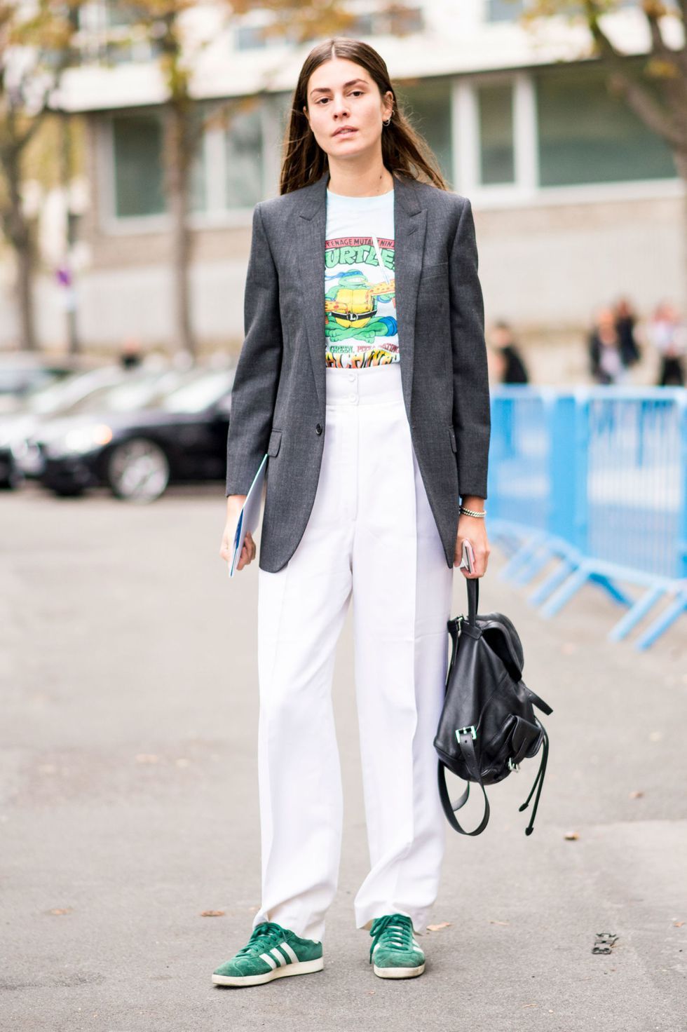 Tiesios juodos kelnės su klostėmis, su mažais rankogaliais ir balti sportbačiai yra klasikinis ansamblis. Tandemas harmoningai atrodo derinamas su vienspalvėmis palaidinėmis, džinsiniais marškiniais, švarkais. Toks kostiumas tinka ne tik kasdieniams pasivaikščiojimams, bet ir darbui. Kad apranga neatrodytų pernelyg paprasta, ji papildoma aksesuarais.