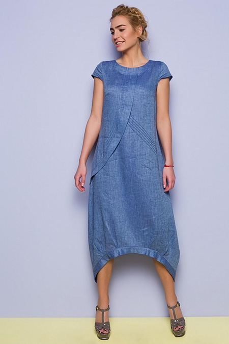 - A siluetas. Drabužius išsiskiria platėjančiu sijonu nuo juosmens arba krūtinės. Laisvas kirpimas paslepia figūros trūkumus pilvo ir klubų srityje. Patogi lininė suknelė gali turėti skirtingus apačios įrėminimo variantus: apatinė sijono dalis yra tiesi, įstriža, banguota linija. Šis aprangos variantas tinka tiek dalykiniam, tiek laisvalaikio įvaizdžiui kurti.
