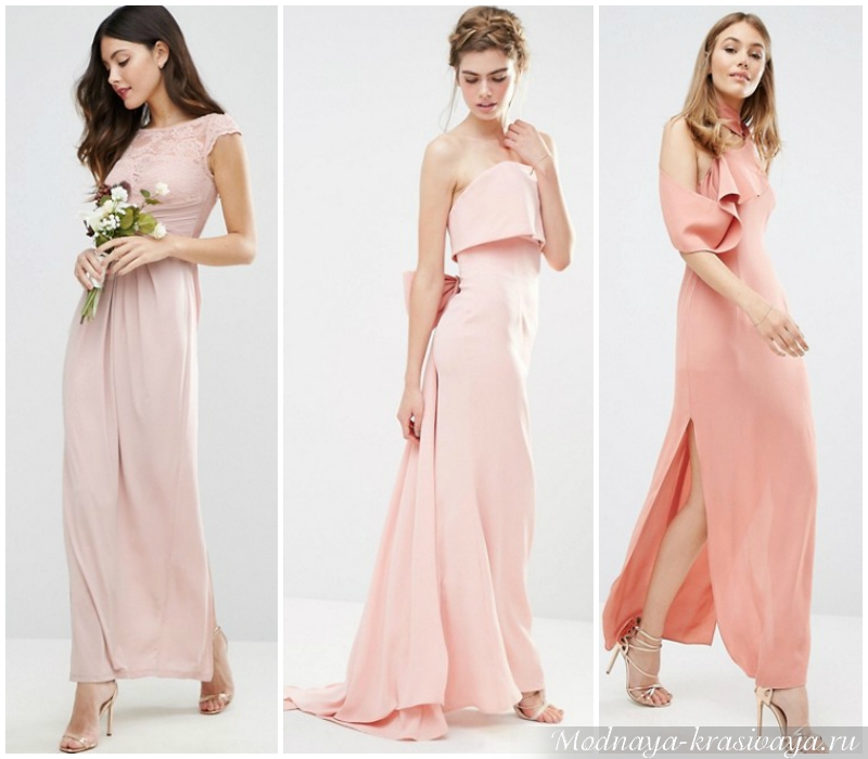 - vakarinis pudros spalvos įvaizdis bus stulbinantis, jei pasirinksite subtilią suknelę kartu su ryškiomis bateliais;