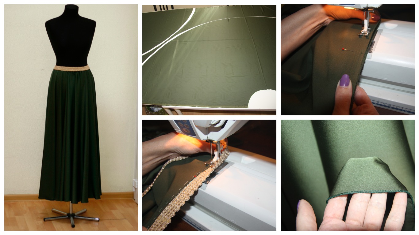 - Ilgą sijoną labai lengva pasiūti elastine juostele. Tai idealus variantas, jei reikia paslėpti kojų trūkumus. Audinys sukerpamas į du stačiakampius. Plotis yra klubų apimtis, padauginta iš 1,3–2 (priklausomai nuo gatavo gaminio pilnumo). Prie norimo ilgio pridedama 5–6 cm siūlėms. Susiuvus dalis ir apdirbus siūles, belieka tik įkišti elastinę juostelę ant viršaus.