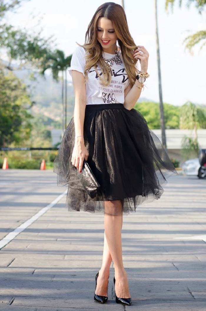 Pavyzdžiai, ką galite dėvėti su juodai baltu sijonu: